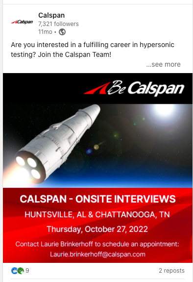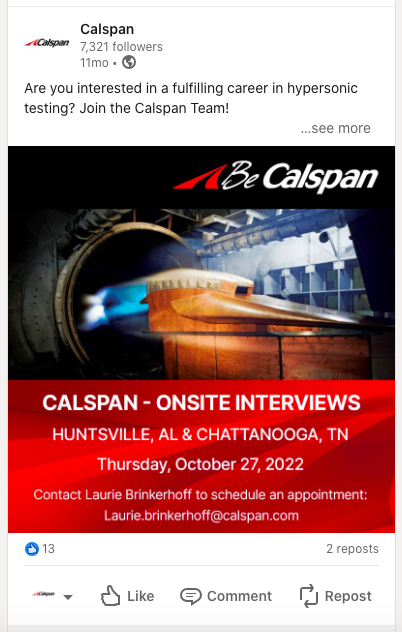 Collaborated with Calspan’s human resources team to create graphics to post on LinkedIn. These informational graphics were used to spread information about the Career fairs Calspan was attending in Alabama and Tennessee.